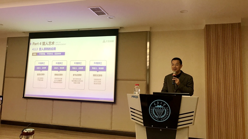 本次讲座主要分为两部分,首先张辅辙介绍了“管理的艺术”的相关理论,然后结合大信会计师事务所公司的管理实践,从道、法、术、器、势五个方面向到场师生进行分享。