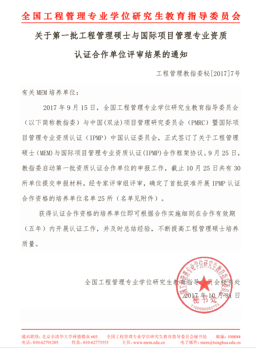 2017年10月31日,全国工程管理专业学位研究生教育指导委员会公布了《关于第一批工程管理硕士与国际项目管理专业资质认证合作单位评审结果的通知》(工程管理教指委秘[2017]7号)文件,重庆大学顺利通过认证,成为全国首批25所开展国际项目管理专业资质认证(IPMP)认证合作资格培养单位之一。